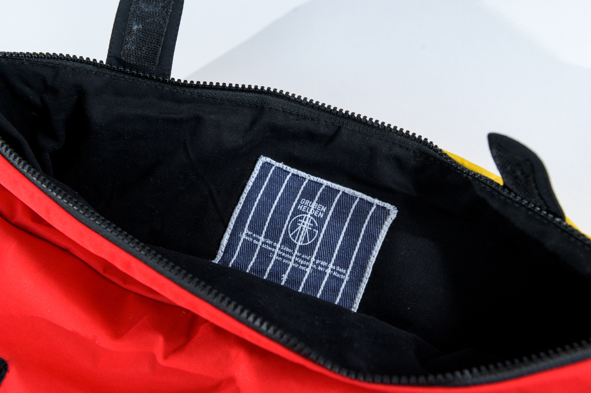 In order to make the two special upcycled bags, a backpack and a weekender, Grubenhelden used two discarded DHL jackets. In total, five people from the brand's team worked on the designs. After creating the initial sketches for the bags, they move onto the design process, unpicking the stitches on the jackets by hand before cutting them up and reworking everything from the fabric to the zippers and hoods. The bags inner pockets are made out of zippers while the outer pockets from the hoods, but many design details were left intact, as a small homage to DHL.